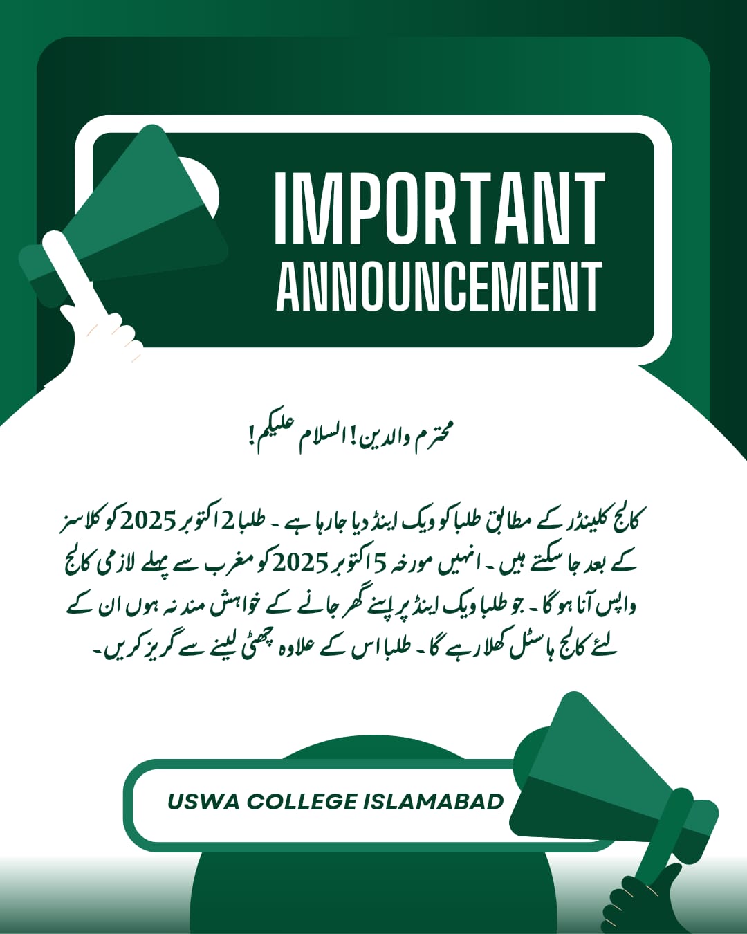 Dissemination of education both in quality and spread must get highest priority if our nation is to pull out of the quagmire that we have sunk into. Magnitude of the task demands mobilization of colossal effort which may not be possible for Government to undertake in public sector alone. The challenge has to be shared by private sector. Uswa College Islamabad is one manifestation of its dedication to the cause of education. The College has set ambitious goals to fulfill its mission so that by the time they complete F.Sc level studies at the College, a crop of knowledgeable, disciplined and patriotic young lot is ready to serve the nation. Established in April 2003, Uswa College Islamabad has, with the grace of Allah, made impressive strides in academics, co-curricular activities and environmental refinement. The College is getting introduced throughout Pakistan, and a need was felt to launch a website to address various queries, and facilitate prospective students and their parents/guardians. It is hoped that this website shall provide much needed information about the College.
